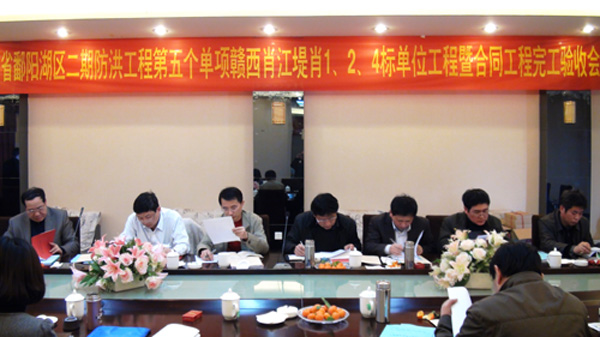 驗(yàn)收會(huì)由江西省鄱陽湖區(qū)二期防洪工程第五個(gè)單項(xiàng)工程建設(shè)項(xiàng)目部副主任陶理志主持,建設(shè)項(xiàng)目部總工程師鄒軍賢、宜春市水利局劉啟明副局長(zhǎng)、樟樹市水利局吳學(xué)輝、公司副總經(jīng)理胡鴻煌等出席了驗(yàn)收會(huì)。