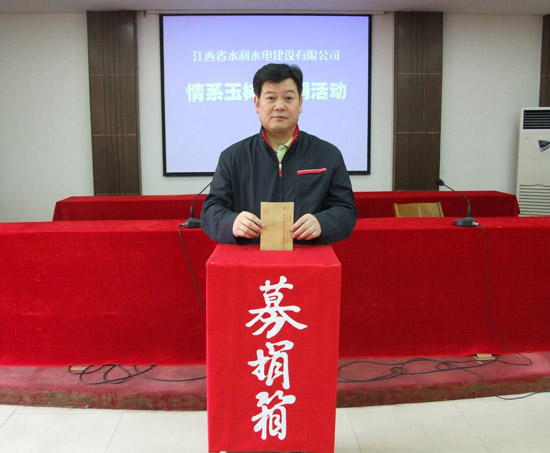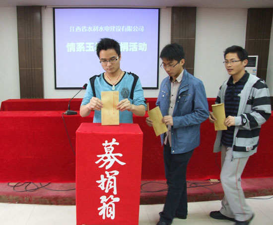 2010年4月14日,青海省玉樹縣發(fā)生兩次地震,最高震級7.1級,造成了當?shù)鼐薮蟮娜松韨龊拓敭a(chǎn)損失,“玉樹地震”牽動著億萬人民的心,也牽動著我司所有員工的心!公司在全司范圍內(nèi)積極開展“情系玉樹募捐活動”,4月26日,我公司南昌市機關(guān)總部首先開展了“情系玉樹募捐活動”,公司中層以上管理人員和員工踴躍參與募捐活動,紛紛獻上自己的一份愛心,體現(xiàn)出江西水總?cè)说纳鐣熑胃校⊥瑫r,各分公司、國內(nèi)外施工項目部也在開展此項活動,預(yù)計此項活動將募得資金3萬余元。