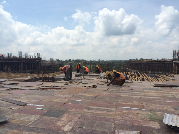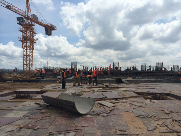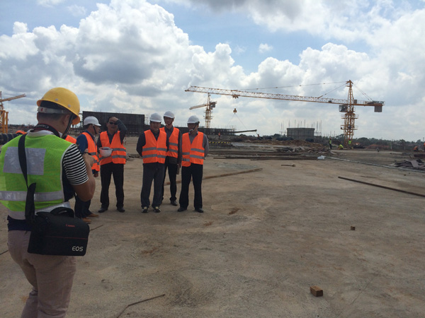 “雙河”項目是一個集零售商場、現代辦公樓、公共娛樂以及配套設施的綜合性工程,作為東非最大的在建城市綜合體,總建筑面積為18.2萬平方米,單層面積就超過四萬多平米。雖然出國前我對“雙河”項目就有一定的了解,但親臨現場,感受工地的壯觀,內心仍然受到巨大的震撼。這個項目涉及到的工程類別較多,施工統籌及安全質量監控難度較大。在施工現場,我們看到各作業工種工作安排得井井有條,各類安全標識及安全設施科學規范,雖然現場施工作業人數超過1000多人,但讓人感覺既熱火朝天,又忙而不亂有條不紊地進行著。